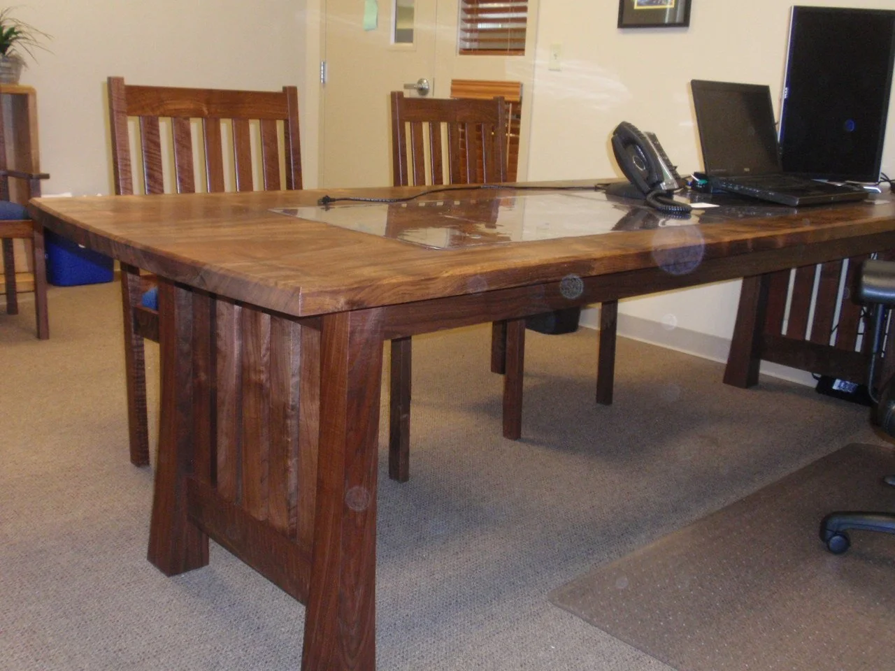 Oregon Black Walnut Office Set. 9' Table, Chairs And Wall Cabinet.